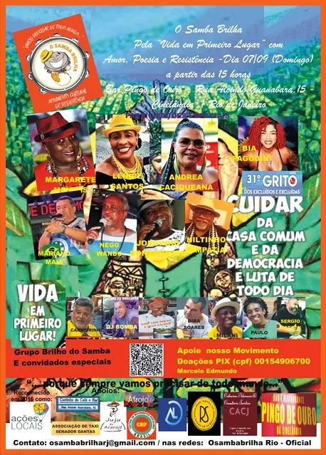 Domingo, dia 07 de setembro, domin no Dia da Independência do Brasil, o Movimento de Resistência Cultural "O Samba Brilha" realizará sua tradicional roda de samba de raiz fortalecendo o 31º Grito dos Excluídos/RJ, assegurando a vez e a voz de todo um povo que através de suas diferentes formas de manifestações sociais, artísticas e culturais constrói, cotidianamente, sua identidade para garantia de nossa história e tradições.