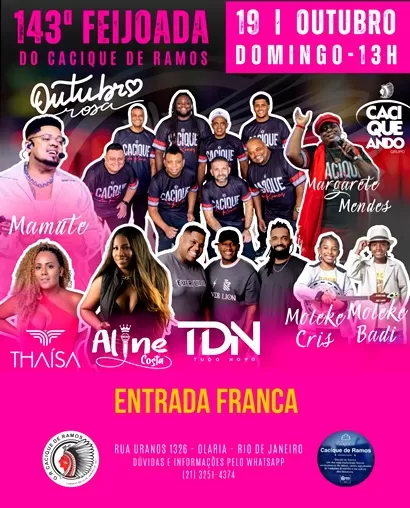 No domingo, 19 de outubro, a partir das 13h, o Cacique de Ramos realiza a 143ª Feijoada, que integra a Campanha Outubro Rosa. O público poderá apoiar a causa adquirindo a camiseta da ação na boutique do Doce Refúgio. A entrada é franca.