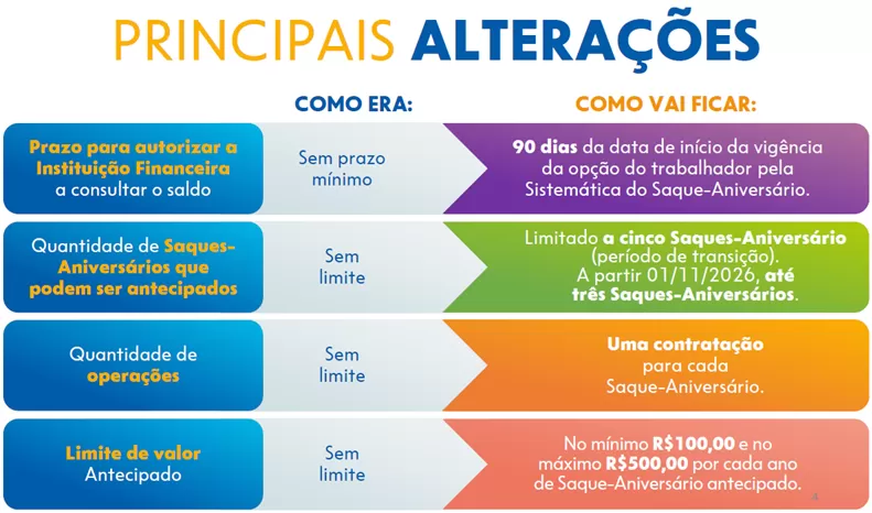 A CAIXA começa a operar com as novas regras para a antecipação do Saque-Aniversário do FGTS, conforme estabelece a Resolução nº 1.130/2025, publicada em 20 de outubro. Os ajustes estabelecem limite para a quantidade de operações, intervalo entre adesão ao Saque-Aniversário e contratação de operação de antecipação, bem como os valores mínimo e máximo a serem antecipados. As operações contratadas até a última sexta-feira (31) não serão afetadas pelas novas regras.
