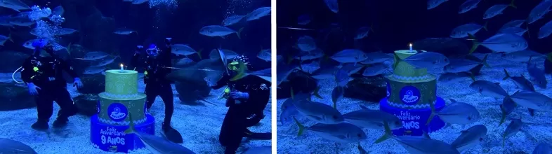 Nesta segunda-feira, 10 de novembro, o AquaRio celebrou seus nove anos de história com uma festa de aniversário. O evento contou com uma decoração temática especial e um bolo comemorativo no lobby, onde funcionários e visitantes se reuniram para cantar parabéns. O Zé Tubarino, mascote do AquaRio também marcou presença, interagindo com o público e posando para fotos ao lado da placa comemorativa criada especialmente para a data. Como parte da celebração, os visitantes puderam acompanhar um mergulho no tanque principal, que recebeu com um cenário festivo com bolo temático submerso.