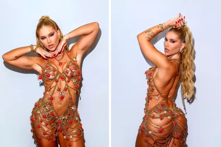 Cada detalhe do traje reforçou o tema da escola e também a força da mulher que representa a bateria. Vale mencionar que esta não será a primeira vez que Virginia Fonseca levará para os ensaios elementos que se conectem com a Grande Rio.