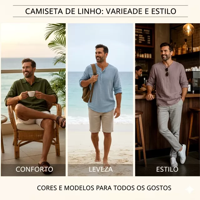 A camiseta masculina de linho, seja lisa ou estampada, é sinônimo de leveza, estilo e conforto. Ela combina com tudo: das peças mais casuais, como jeans e bermudas, até as mais elegantes, como calças de sarja ou alfaiataria.