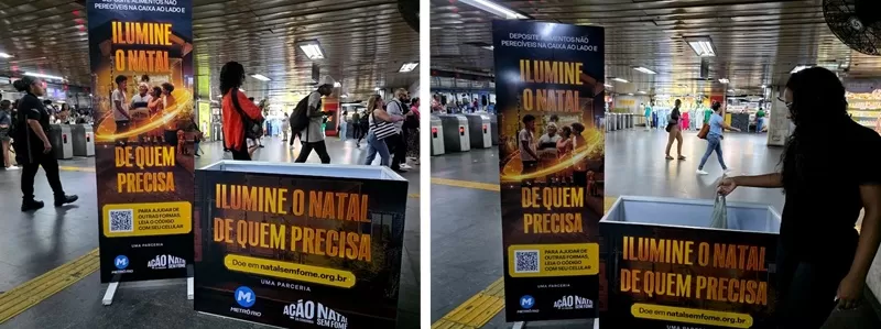 A partir desta semana, o MetrôRio recebe doações de alimentos não perecíveis em dez estações do sistema metroviário para a campanha Natal Sem Fome, realizada pela ONG Ação da Cidadania. Com o tema "Ilumine o Natal de quem precisa", as caixas coletoras e os totens da campanha estão disponíveis nas estações: Pavuna, Del Castilho, Uruguai/Tijuca, Saens Pena/Tijuca, Central do Brasil/Centro, Carioca/Centro, Botafogo, Cantagalo/Copacabana, General Osório/Ipanema e Jardim Oceânico/Barra da Tijuca.