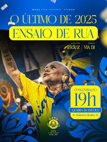 A partir de 21h desta quinta-feira (18) todos os segmentos e integrantes de alas da comunidade da Unidos da Tijuca estarão cantando pela última vez no ano 2025 no ensaio de rua, o samba criado para contar o enredo que abordará a memorialista, compositora e multi-artista mineira, autora do best-seller "Quarto de Despejo - O Diário de uma favelada", Carolina Maria de Jesus. O ensaio acontece na Via D1, localizada atrás da quadra da agremiação no Santo Cristo.
