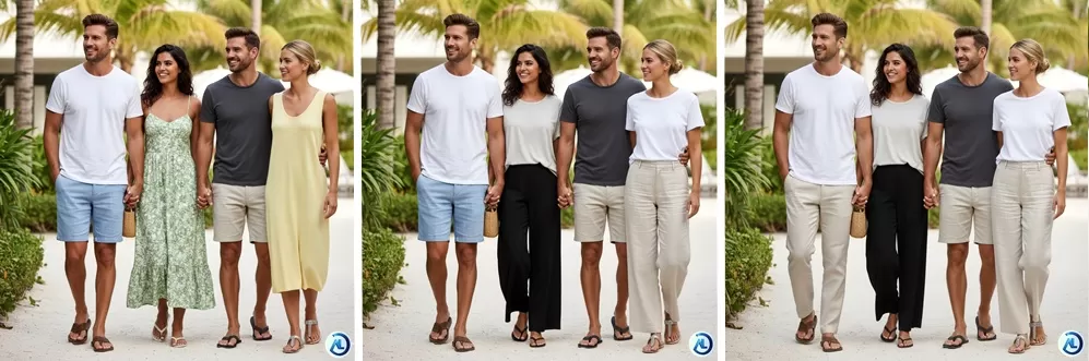 Para as mulheres, a escolha ideal é um vestido leve, solto e confortável, confeccionado em tecidos respiráveis como algodão, linho ou malha fria. Complete o look com sandália ou chinelo com strass, trazendo charme e delicadeza na medida certa.
