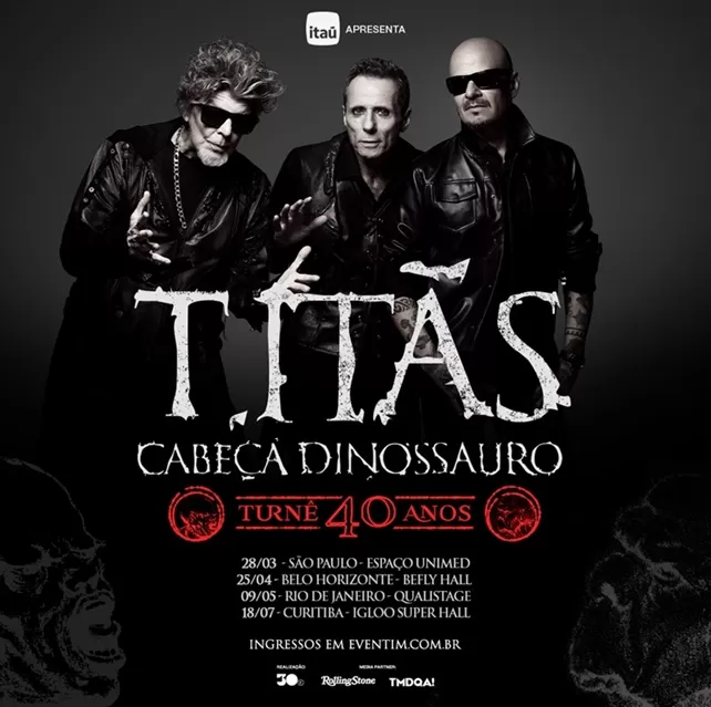 Em 2026, um dos álbuns mais icônicos e provocadores da música brasileira completa 40 anos. Cabeça Dinossauro, lançado pelos Titãs em 1986, transformou a banda e o próprio rock nacional ao romper padrões, desafiar o conservadorismo e traduzir, em som e fúria, o espírito de um país em transição. O Brasil tentava reaprender o significado de liberdade depois de duas décadas de censura e autoritarismo, e o álbum virou o retrato cru de uma geração inconformada. Quatro décadas depois, em um país novamente atravessado por polarização e intolerância, o grito de Cabeça Dinossauro volta a soar necessário e atual. É essa força de expressão — de resistir, de questionar e de pensar o presente — que os Titãs Branco Mello, Sérgio Britto e Tony Bellotto pretendem reacender com a turnê “Titãs – Cabeça Dinossauro 40 anos”, que tem estreia marcada para 28 de março de 2026, no Espaço Unimed, em São Paulo, em uma realização da 30e, maior companhia de entretenimento ao vivo do país, e apresentado pelo Itaú. A tour também tem passagem confirmada por: Belo Horizonte (25/04); Rio de Janeiro (09/05) e Curitiba (18/07). A pré-venda exclusiva para clientes do Itaú tem 15% de desconto no valor dos ingressos para compras realizadas com cartões de crédito do banco e começa no dia 16 de dezembro, às 10h; a venda geral começa às 12h do dia 18 de dezembro, pelo site da Eventim (acesse aqui). Novas datas da tour serão anunciadas em breve.