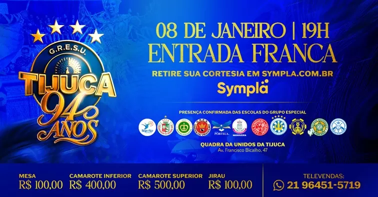 Vendas On-line: https://www.sympla.com.br/evento/festa-de-aniversario-da-unidos-da-tijuca-94-anos/3256356