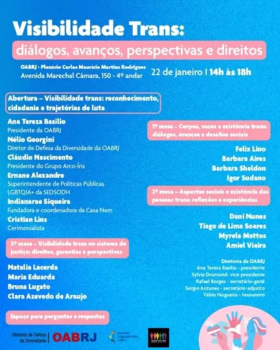 A Ordem dos Advogados do Brasil – Seção Rio de Janeiro (OABRJ) promove, no dia 22 de janeiro, das 14h às 18h, o evento “Visibilidade Trans: diálogos, avanços, perspectivas e direitos”, no Plenário Carlos Maurício Martins Rodrigues, na sede da instituição, no Centro do Rio.