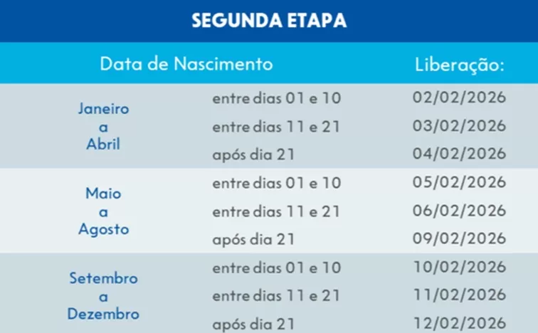 A segunda etapa contemplará o saldo remanescente estimado em cerca R$ 4,6 bilhões. O pagamento será realizado de forma escalonada entre 2 e 12 de fevereiro de 2026, conforme dia e mês de nascimento: