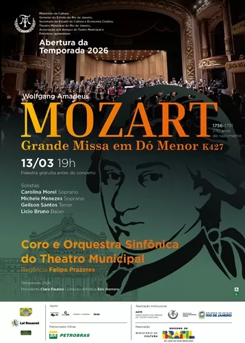 A temporada 2026 será oficialmente aberta no dia 13 de março, às 19h, com a Grande Missa em Dó Menor- K427, de Wolfgang Amadeus Mozart. A obra será interpretada pelo Coro e Orquestra Sinfônica do Theatro Municipal do Rio de Janeiro (OSTM), sob a regência do maestro titular, Felipe Prazeres, em homenagem aos 270 anos de nascimento do compositor austríaco.