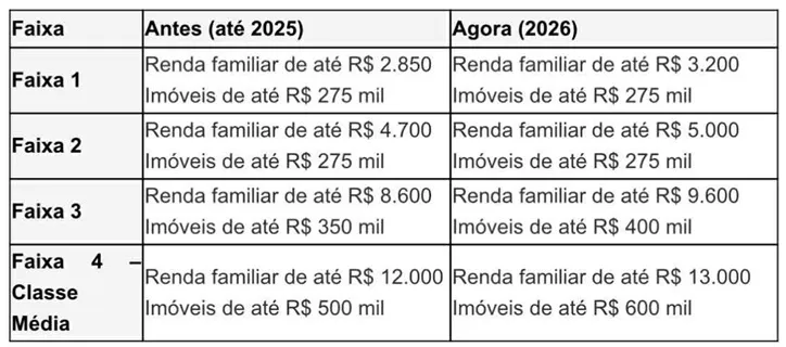 Com as mudanças, o programa passa a atender famílias com renda mensal de até R$ 13 mil, incluindo de forma mais ampla a classe média. Também houve aumento dos tetos dos imóveis financiáveis, que agora podem chegar a R$ 400 mil na Faixa 3 e a R$ 600 mil na Classe Média, enquanto as Faixas 1 e 2 seguem com limites regionais definidos de até 275 mil de acordo com o porte de cada municípios.
